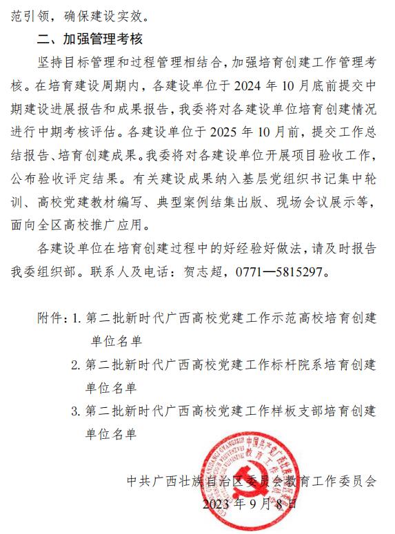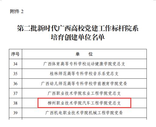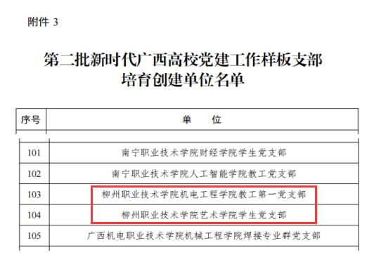 新闻网消息(文、图/党委组织部 骆琴)近日,中共广西壮族自治区委员会教育工作委员会发布《自治区党委教育工委关于公布第二批新时代广西高校党建示范创建和质量创优工作培育创建单位名单的通知》(桂教工委组〔2023〕51号),确定全区5个党建工作示范高校、50个标杆院系、132个样板支部培育创建单位。我校汽车工程学院党总支成功入选第二批新时代广西高校党建工作标杆院系培育创建单位,机电工程学院教工第一党支部、艺术学院学生党支部成功入选第二批新时代广西高校党建工作样板支部创建单位。这是我校在新时代广西高校党建工作中取得的又一份亮眼成绩单。